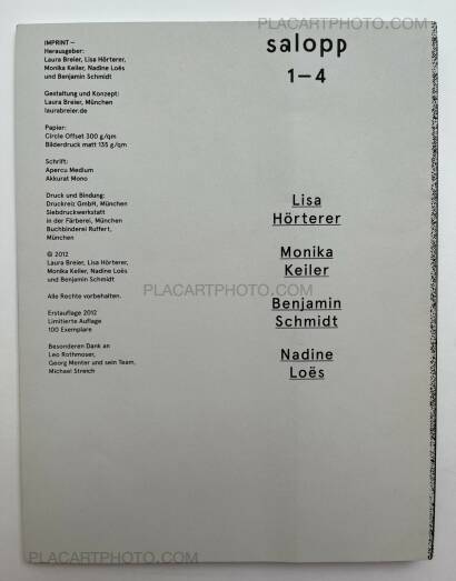 Salopp is a free magazine for young photographers. This first edition from 2012 includes the work of Lisa Hörterer, Monika Keller, Benjamin Schmidt, and Nadine Loës.
